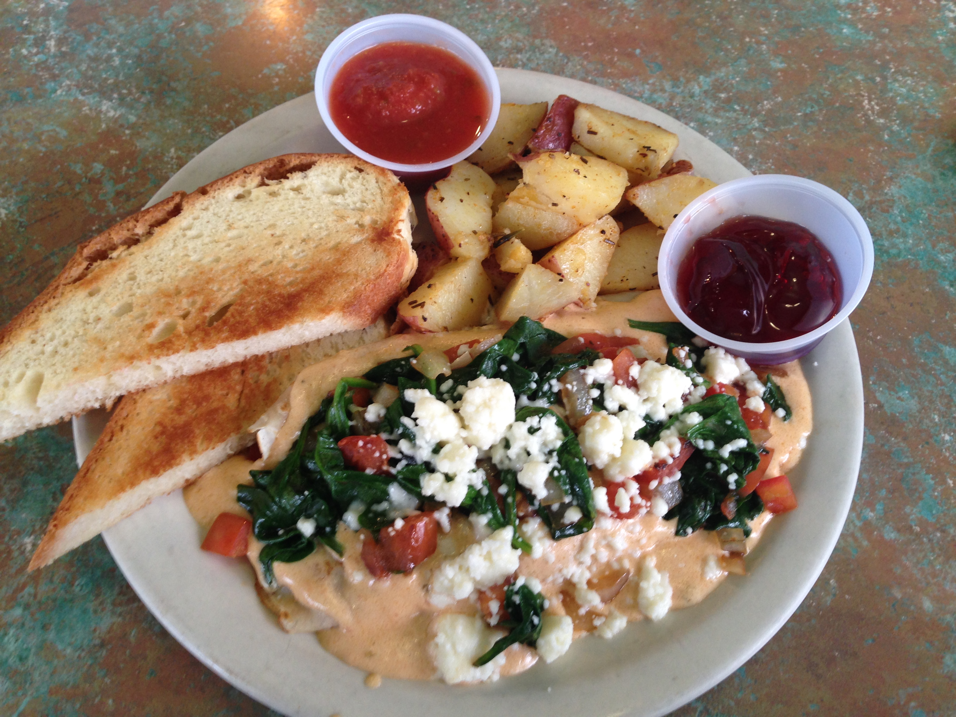 The picture does not do this meal justice. I was completely blown away by how delicious this Spinach Crepe tasted and how well the flavors complimented each other. The potatoes were lightly seasoned in rosemary, almost too lightly for my liking, and the toast was homemade and grilled with fresh jelly.