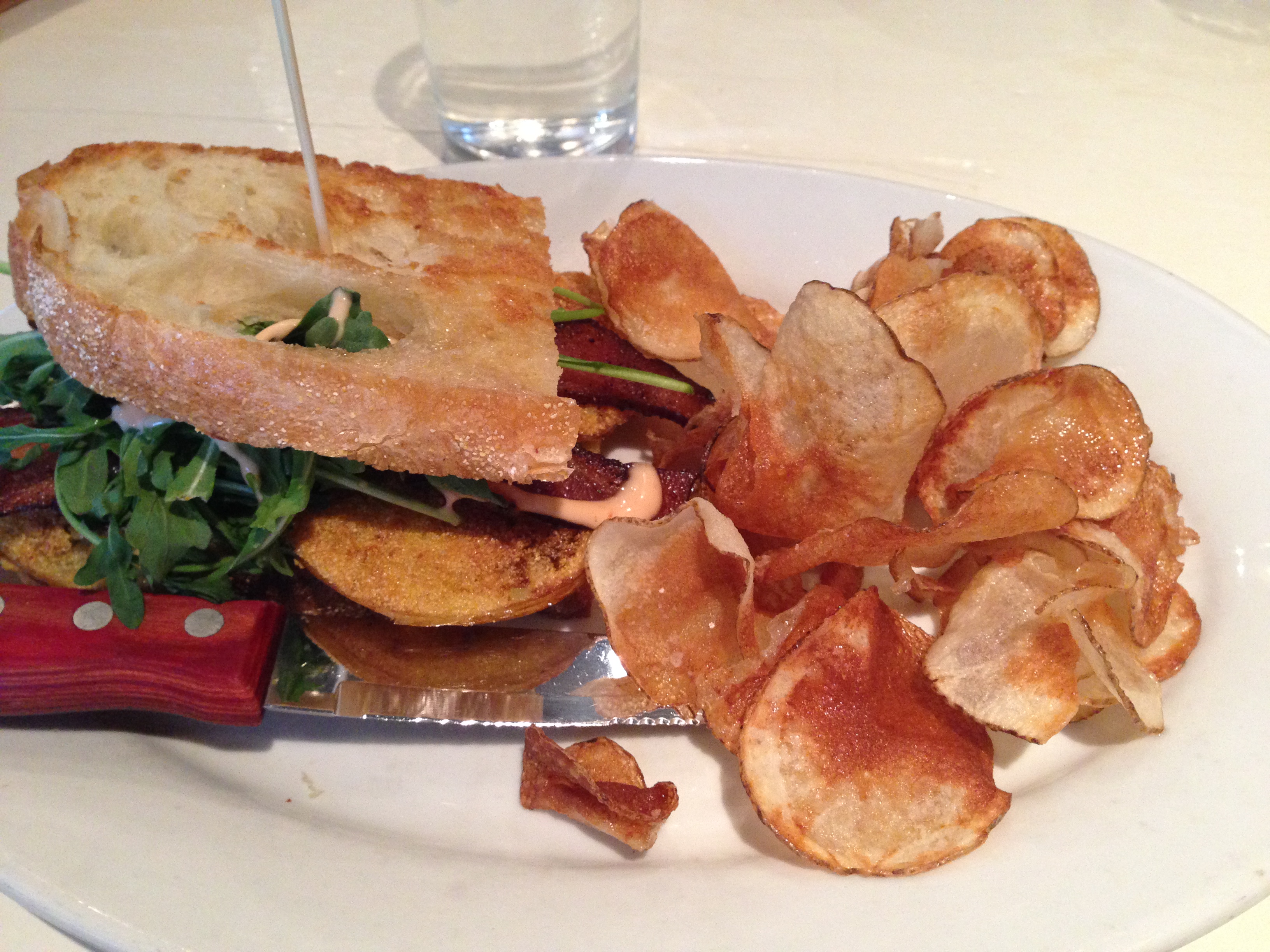 Yes, what you are looking at truly is a masterpiece. You all know how I feel about BLT’s and this one reigns as King in my book. Arugula, Fried Green Tomatoes, Oddfellows Sauce and Guacamole…apparently those are the four items into my heart. And lets not forget about the homemade chips — crisped to perfection and seasoned ever so slightly. The plate looked as though I had licked it clean upon my departure and my stomach was satisfied to the point of true bliss.