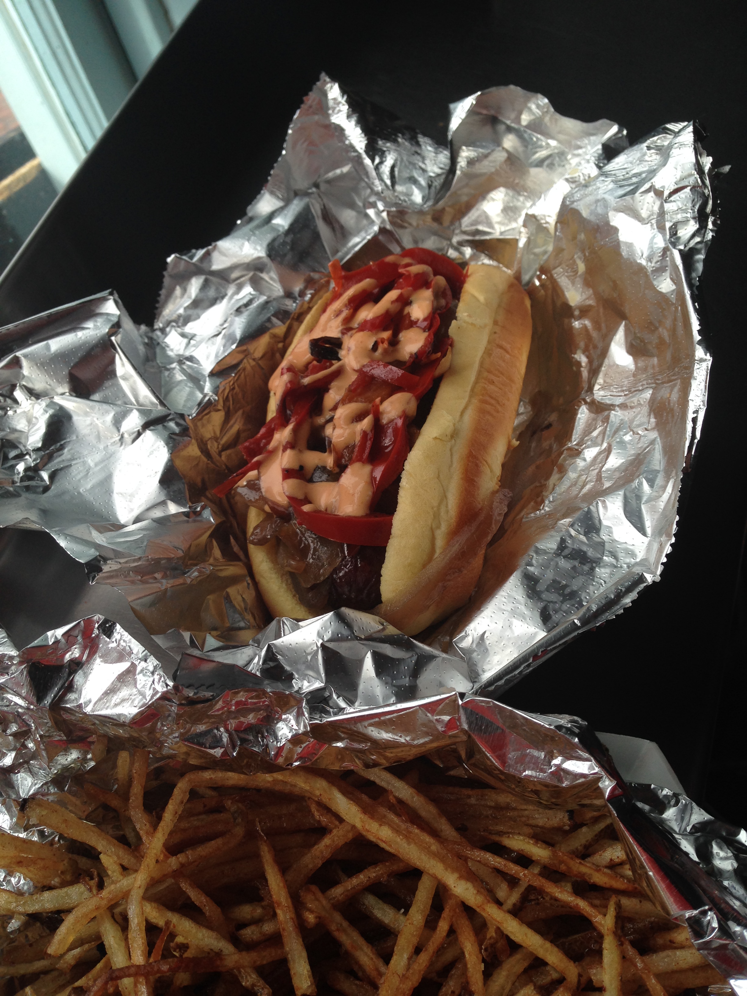Being a Chicago native, it is hard for a hot dog from another city to grab my attention or tastebuds. I was blown away by the offerings from Stuggy’s in the Fells Point neighborhood of Baltimore. Their large menu selection can have you standing, staring and salivating for minutes on end. You can get an all beef, bacon-wrapped, turkey, veggie, polish, italian and even wild game dog! Some of the menu options, just to get your mouth watering, are titled: Bob Marley, Beast, Bruce Lee, Maui Wowie and the chosen one, for my first time; The LA Dog.